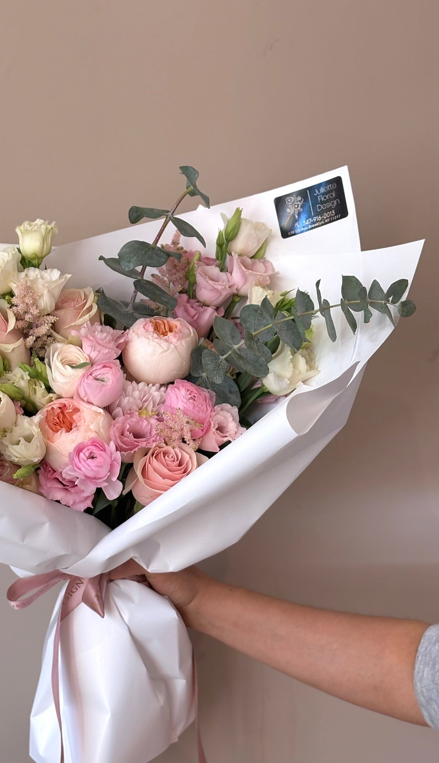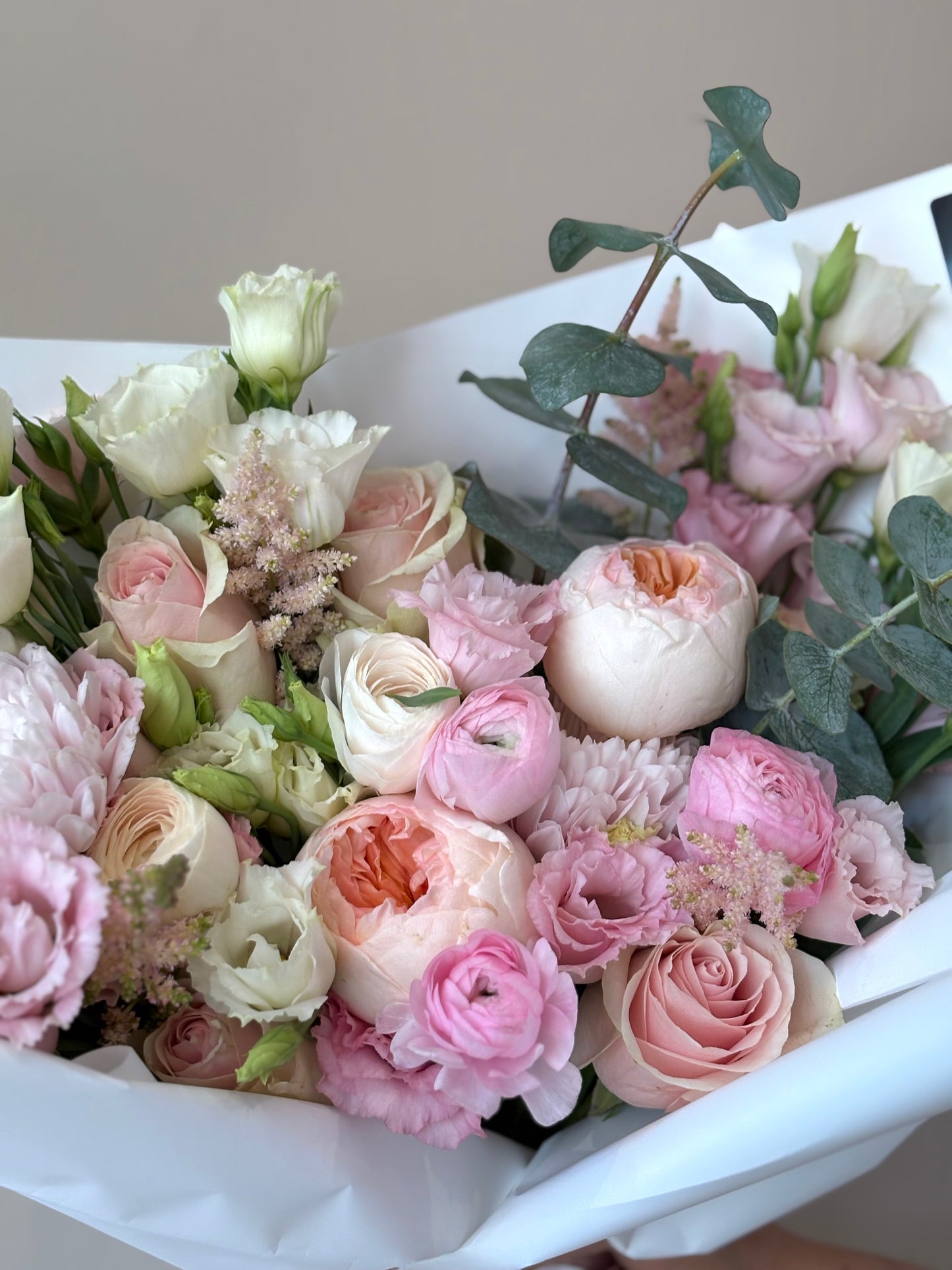 Juliette roses/ pink roses /pink & white lisianthus/pink astilbe /pink ranunculus/ pink chrysanthemum and accents of green eucalyptus.