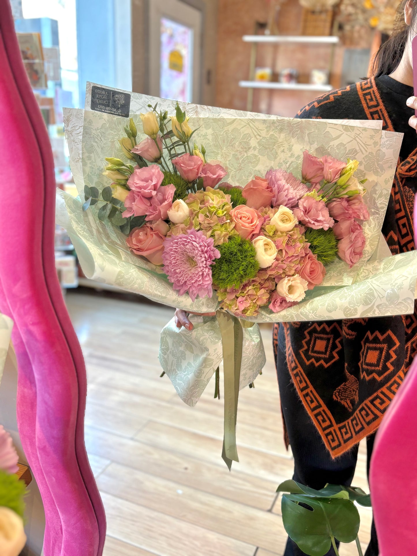 Hydrangeas, lisianthus , chrysanthemums, ranunculus , dianthus .