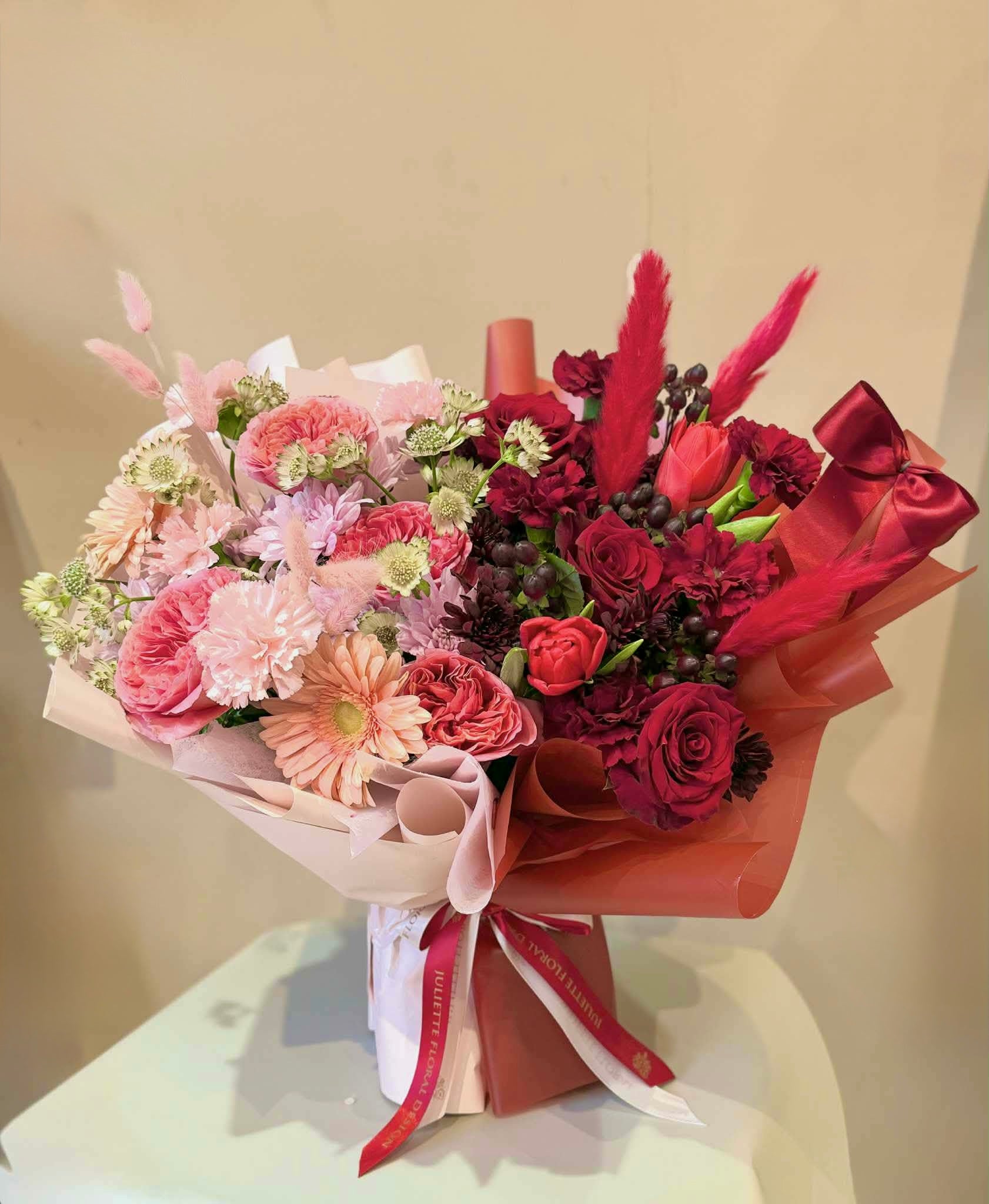 We work with seasonal flowers, so sometimes we may have to readapt the design to the available stock. We always make the new design as close as possible to the original one.