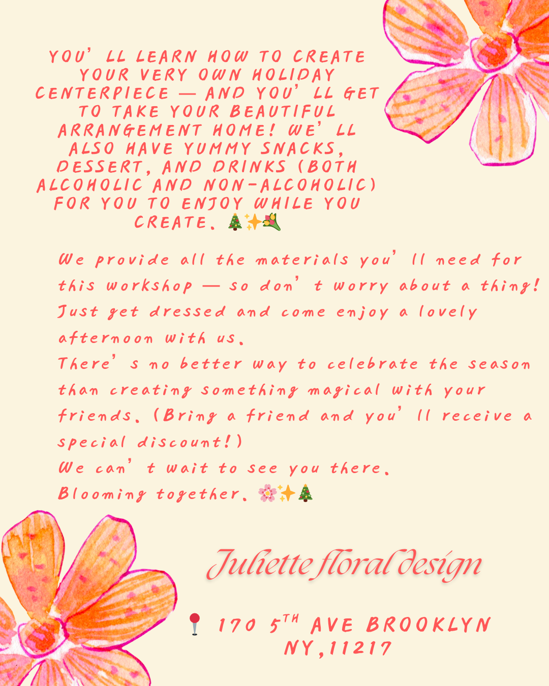 🌿You’ll learn how to create your very own holiday centerpiece — and you’ll get to take your beautiful arrangement home! We’ll also have yummy snacks, dessert, and drinks (both alcoholic and non-alcoholic) for you to enjoy while you create.Â