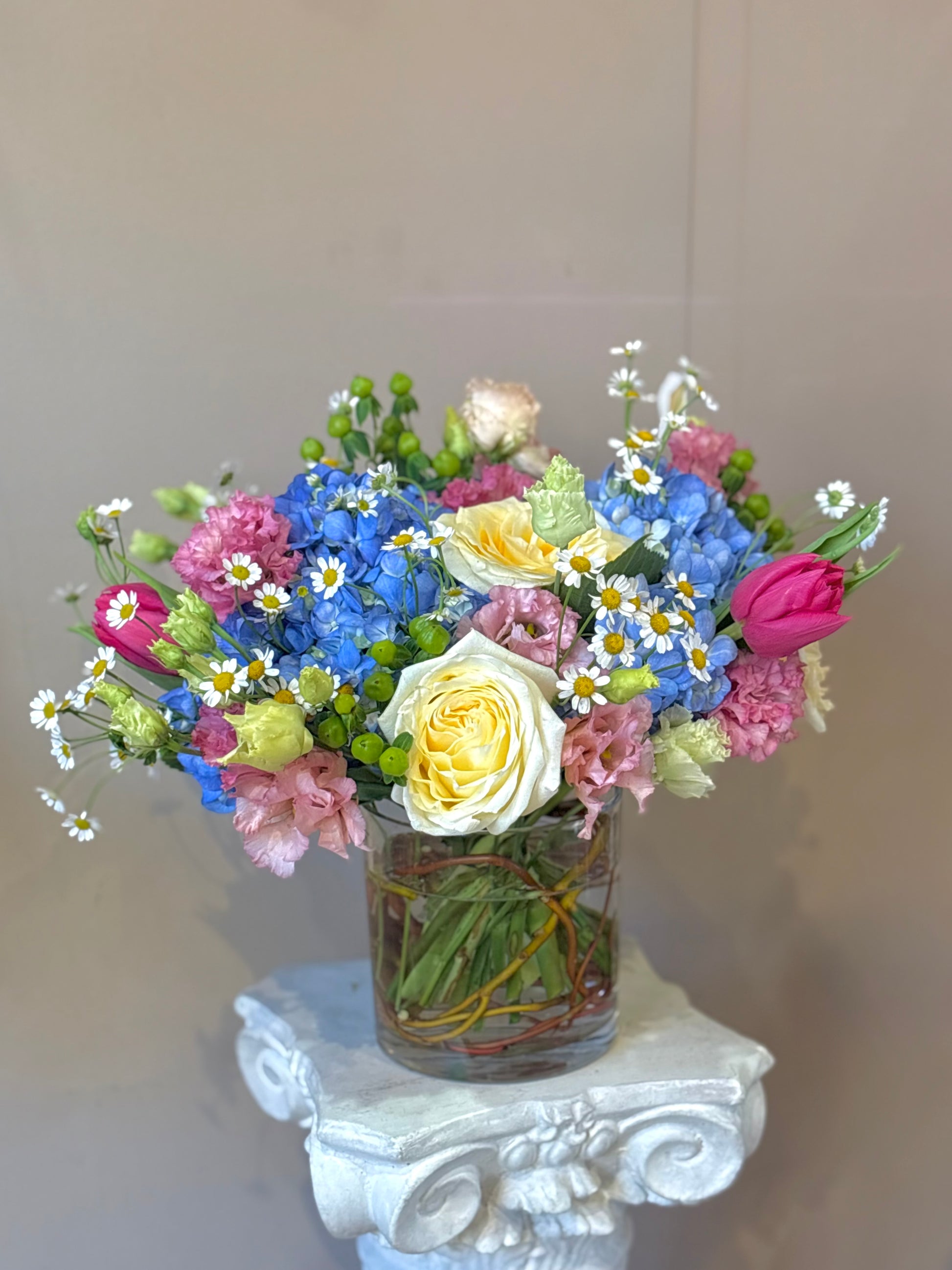 We work with seasonal flowers, so sometimes we may have to readapt the design to the available stock. We always make the new design as close as possible to the original one.
